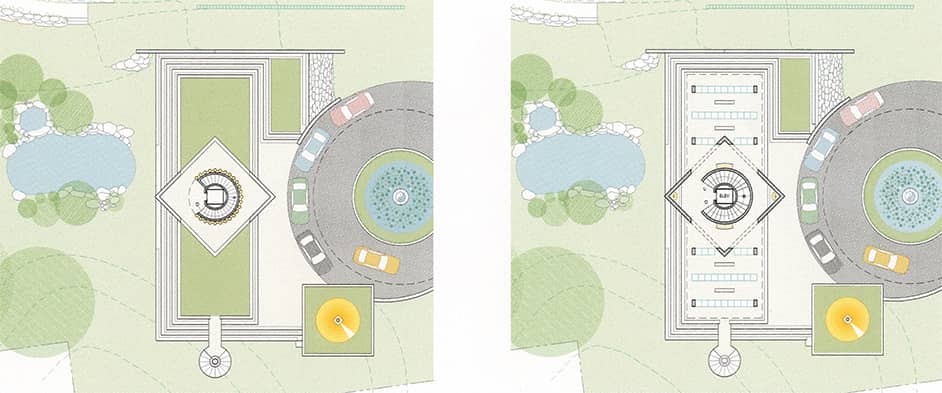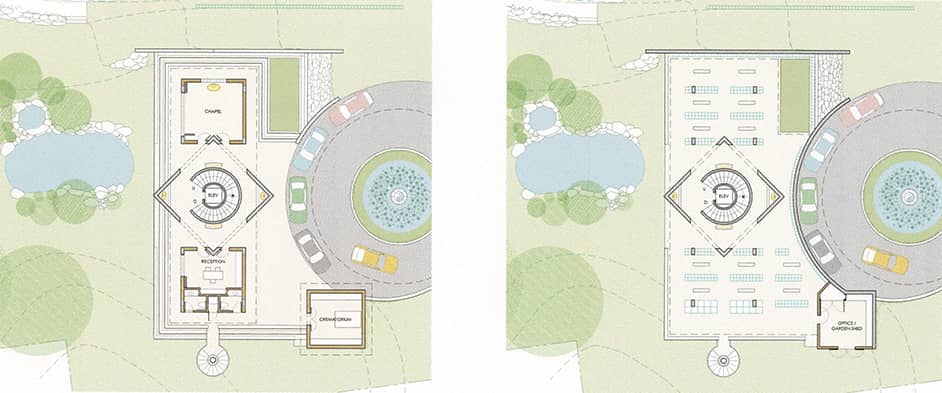 The two lower levels would be reserved for those cremated in the more contemporary way and include a garden shed on the ground level and an office above it. The Main Level would be near grade, vehicular access, and limited parking on the east and include a public plaza, chapel, contemporary crematorium, reception room, toilets, stair, elevator, and niches. Sealed glass cases would display each family's special urns and memorials.