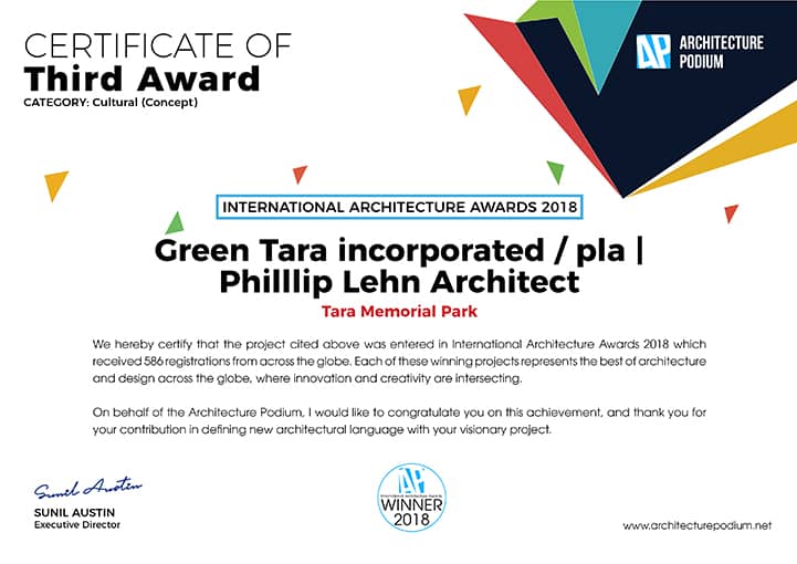 For more information about Architectural Podium's International Architecture Awards 2018, see http://www.architecturepodium.net/portfolio/tara-memorial-park-green-tara-incorporated-pla-philllip-lehn-architect/ and http://www.architecturepodium.net/international-architecture-awards-2018-results/