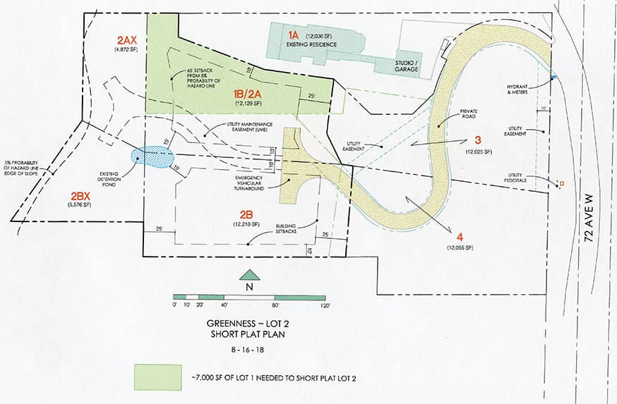 GTi’s ~ 7,000 SF (shaded green and labeled "1B/2A" above) is considered a "key" because it can be either added to lot 1 or 2 and would be needed to subdivide lot 2 into 2 lots. GTi obtained the City of Edmonds' Preliminary Short Plat Approval for the subdivision and may be willing to help its buyer obtain the City's final approval. GTi is currently offering to sell its ~ 7,000 SF for $200,000 plus view protections and a perpetual easement for the owners of Lot 1 to occasionally use and enjoy its mid-level path and Fire Pit Point.